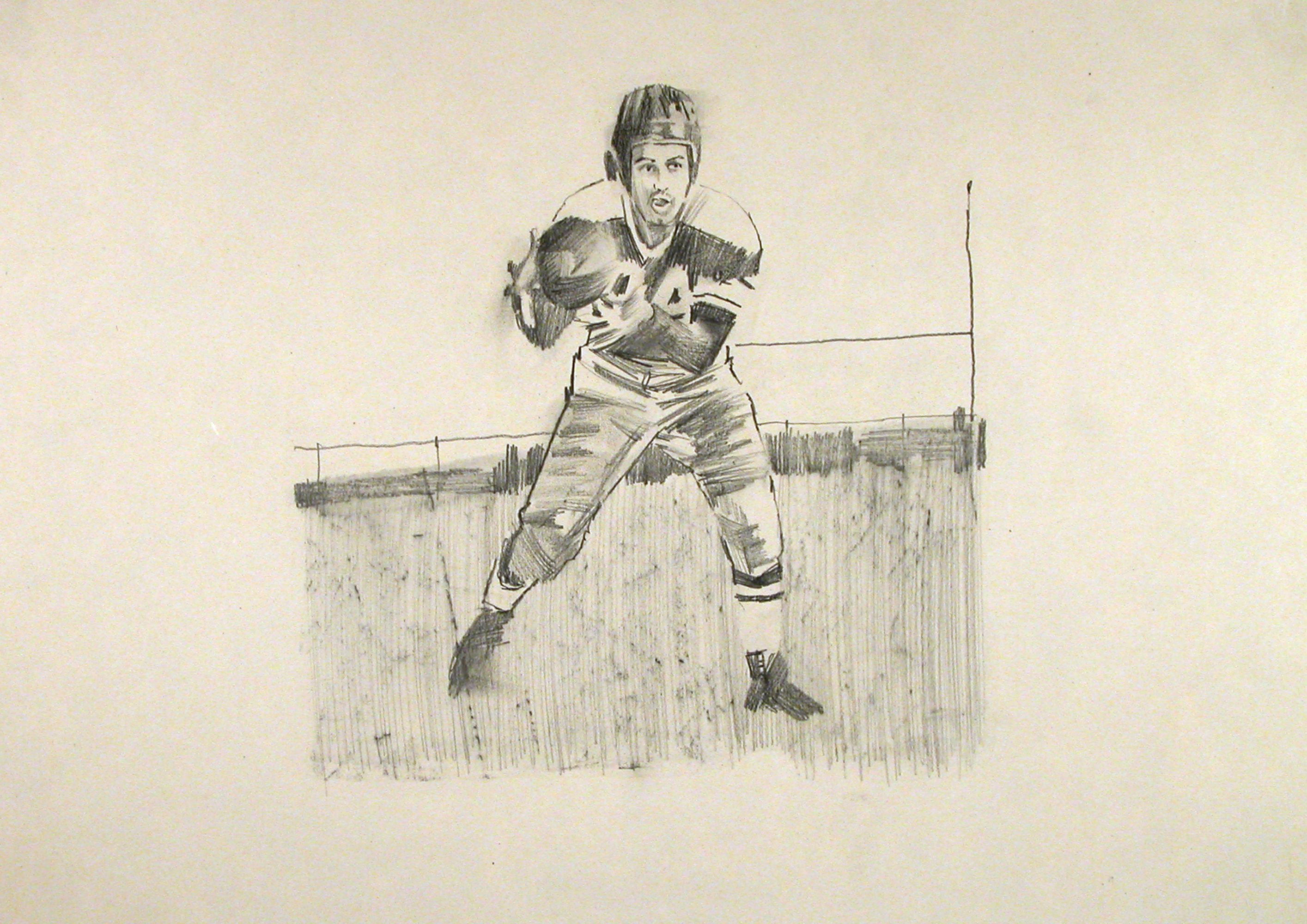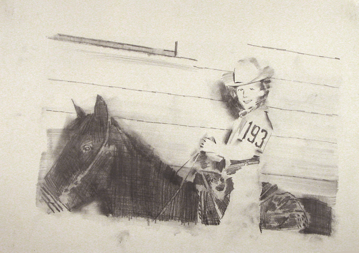 A multitude of subjects, whether childhood memories from a 1960’s middle-class “suburbia” in Utah or a recent front-page photo of the latest Wall Street swindler, seems to post no limits as to origin or timeframe. All of his images are icons of everyday life of both past and present. A post-industrial urban landscape blurs into the wide forested horizon of Wyoming, the American West. Faded photographs share space with modern-day Italian gangsters and politicians. A miserable character extracted from Goya’s Disasters of War meets Tex Willer and John Wayne. Several Playboy Bunnies and a Singer sewing machine are alongside late-night movie heroes with baseball players. One of these images alone is not mysterious, but collected, the “memorabilia” in these drawings is disquieting and revelatory.